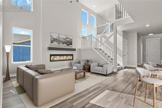 Modern design, generous living space, and quality finishes come together in this new construction home in the highly desirable Cordera community. Offering over 3,100 square feet of living space with 5 bedrooms and 4 bathrooms, the layout is designed to provide both comfortable living and flexible space for guests or entertaining. The main level features LVP flooring throughout and a welcoming great room with soaring ceilings and an expansive electric fireplace. The kitchen is well-appointed with quartz countertops, a center island, crown moulding, wall oven, gas cooktop, and pantry, opening seamlessly to the dining area with walk-out access to the yard. A main-level bedroom and full bath add versatility for guests or office space. Upstairs, the primary suite offers a spacious retreat with a five-piece bath finished with quartz counters, soaking tub, and stand alone shower with bench and a walk-in closet. A loft creates additional living space, while two additional bedrooms and convenient upper-level laundry complete the floor. The finished basement expands the home with a spacious family room, fifth bedroom, and full bath. Outside, the landscaped yard and 3-car tandem garage add convenience, all within Cordera’s established neighborhood known for its parks, trails, and community amenities!