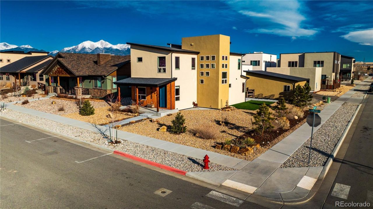 Located on a corner lot in Poncha Springs, known as the Crossroads of the Rockies, this well-maintained home offers abundant natural light, open living spaces, and convenient access to Salida, Monarch Mountain, and the Arkansas River recreation corridor. Large windows throughout the home bring in natural light, and the open staircase with wood treads and metal railing creates a distinctive architectural feature within the main living area. The space beneath the staircase offers a comfortable area that could be used as a reading nook. The kitchen is designed for everyday living and entertaining and includes stainless steel appliances, a Frigidaire gas range, quartz countertops, custom soft-close cabinetry, under-cabinet lighting, a center island, and a spacious pantry. The open floor plan connects the kitchen, dining, and living areas for comfortable flow throughout the main level. A main floor bedroom or flexible office space and a full bathroom provide additional versatility for guests or work-from-home needs. Upstairs, the primary suite features multiple windows, mountain views, and a private bathroom with double vanity, soaking tub, and tiled walk-in shower. Additional bedrooms provide comfortable living space, and the upstairs laundry room includes a utility sink with Maytag washer and dryer. Mechanical systems include natural gas forced-air heating, a high-efficiency furnace, Rinnai tankless on-demand hot water system, and a Culligan water softener. The exterior offers low maintenance xeriscape landscaping with drip irrigation, artificial turf area, and a private patio space. The large corner lot allows additional parking next to the garage and alley access behind the property. The garage includes an electric outlet suitable for vehicle charging or workshop use. Enjoy the small town Colorado lifestyle! Welcome home!