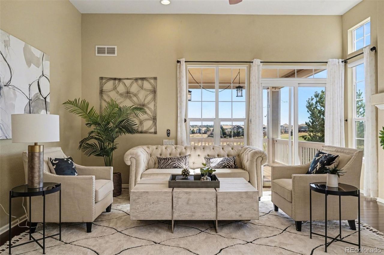 Welcome to this beautifully updated 5-bedroom, 4-bath former model home backing to the golf course in the sought-after Canterberry Crossing Neighborhood! From the moment you step inside, rich hardwood floors and thoughtful architectural details set the tone, including crown molding and a dedicated home office with custom built-ins just off the entry. The open-concept main living area is filled with natural light and features soaring ceilings, a gas fireplace, and seamless flow into the kitchen?complete with quartz countertops, an oversized, custom-built island, abundant cabinetry, and a gas range with a double oven. The main level also includes a spacious primary suite with plantation shutters and a luxurious 5-piece bath, along with two additional bedrooms, a full bath, a 3/4 guest bath, and convenient main-floor laundry. The finished walk-out basement is perfect for multi-gen living! Designed for entertaining, it offers a large recreation space with a wet bar, multiple seating areas, and direct access to the patio. Two additional bedrooms and a 3/4 bath provide ideal space for guests. Additional highlights include an oversized garage with extensive built-in storage and finished floors. Enjoy golf course living with access to neighborhood amenities including a pool, playground, tennis courts, parks, trails, and more?all in a prime Parker location.