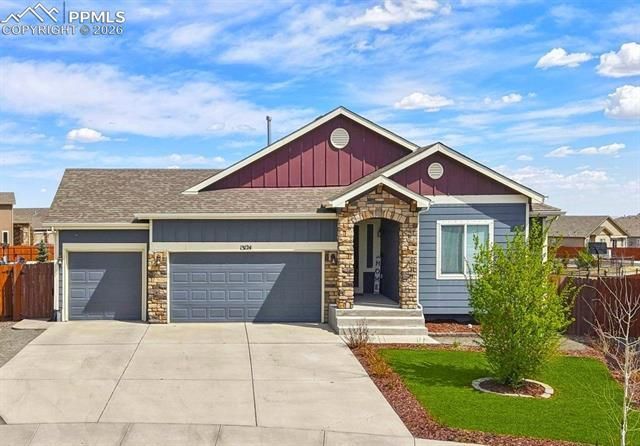 Beautiful 5-bedroom, 3-bath, 3-car garage ranch home blends comfort, space, and style. Tucked at the end of a quiet cul-de-sac on a large lot backing to open space and trails, it offers privacy and scenic views. The bright, open layout offers true main level living featuring three bedrooms, including a spacious primary suite with a 5-piece bath and walk-in closet. The stunning kitchen is designed for entertaining with stainless steel appliances, espresso cabinets, a pantry, and a large quartz island. The great room offers extended hardwood flooring and walks out to a generous deck overlooking open space. The finished basement provides a large family/rec room, two additional bedrooms, a full bath, and ample storage. The fully landscaped yard features artificial turf, extended concrete patio and sidewalk, a storage shed, and split-rail fencing for added privacy. Additional highlights include central air conditioning, ceiling fans, a humidifier, durable fiber cement siding with stone accents, and convenient main-level laundry. The Metro District fee covers water, sewer, and access to the Meridian Ranch Recreation Center In Meridian Ranch, residents enjoy a 42,000 sq ft recreation center with indoor and outdoor pools, water slide, lazy river, lap lanes, a full fitness center with cardio, weights, and group classes, plus a gymnasium for basketball, pickleball, and more. The community also offers an award-winning golf course, miles of scenic walking and biking trails, over 500 acres of parks and open space, neighborhood playgrounds, and access to the 215-acre regional park—creating a truly active, resort-style lifestyle right at home. Conveniently located near Peterson Air Force Base, Schriever Air Force Base, Ft. Carson Army Base, and the U.S. Air Force Academy.