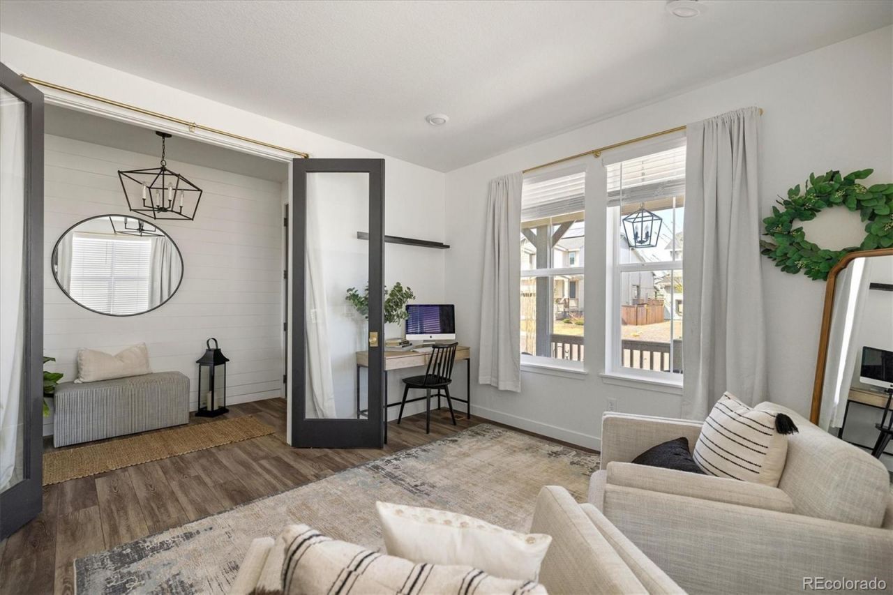 *ASSUMABLE loan at 4.5% to qualified buyers* Prepare to fall in love with this STUNNING home?no detail has been overlooked! From the moment you step onto the front porch, youll never want to leave. Truly better than new with updates galore: fresh paint, luxurious vinyl flooring, black-framed doors & mirrors, custom tile & shiplap, elegant window coverings, designer fans & light fixtures set the tone throughout. The main level is designed for both style and function, featuring a spacious office/bedroom/flex space with custom glass doors, a striking powder room with octagonal tile walls & custom cabinetry with designer hardware. Relax in the great room, complete w/ a modern fireplace and mantle, shiplap walls & large windows for plenty of natural light. The kitchen is a chefs dream w/ elegant cabinetry, gas range, gold hardware, quartz countertops, designer island, custom lighting, stainless appliances, large pantry, office nook & convenient mudroom space. The dining room is highlighted by a gorgeous tiled accent wall & sunlight pouring in on all sides.Upstairs, the layout is equally appealing! The laundry room, 2 spacious bedrooms connected by a Jack and Jill bathroom & large loft/potential bedroom w/ its own full bath make this home very versatile. The primary retreat is pure luxury?featuring a stunning accent wall, a huge walk-in closet, built-in armoire, spa-like bathroom w/ dual vanities, framed mirrors, extra counter space & large shower w/ bench.Lastly, dont miss the backyard oasis, perfect for summer entertaining: a covered deck, hot tub, multiple hangout areas, beautiful garden beds just about to blossom, summer lights & basketball/sports court. The tandem 3 car garage & unfinished basement provide plenty of extra space for storage or additional living space! Plus, the community park, playground & basketball court are just a short walk away. Shopping, dining, parks/trails, commuting access & DIA are right at your fingertips. Dont this gem!