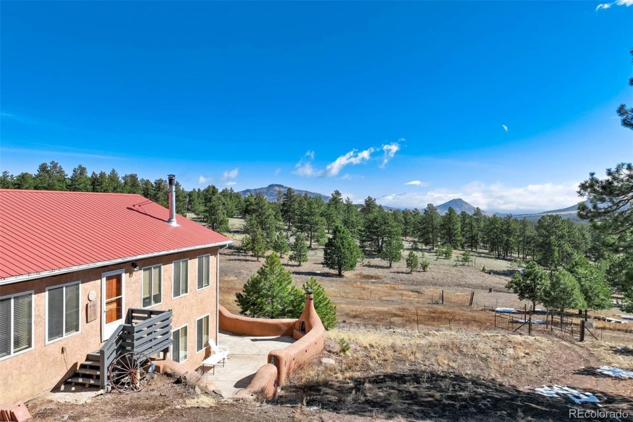 Welcome Home! This 25 acre horse ready property is nestled in the outskirts of charming Guffey with privacy and mountain views, including Pikes Peak. Straw bail home with stucco Spanish design, has built-ins, radiant floor heat, barn, chicken coop, 2 sheds, 2 corals, and completely fenced. The spiral staircase to downstairs bedroom or family room awaits you with a walkout to patio. Saltilo tiles and high ceilings throughout. The lower level has a glass case displaying fossils from years gone by. This truly unique home is waiting for you.