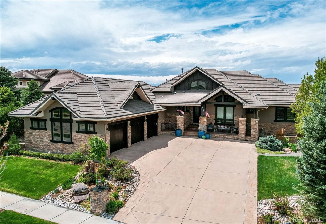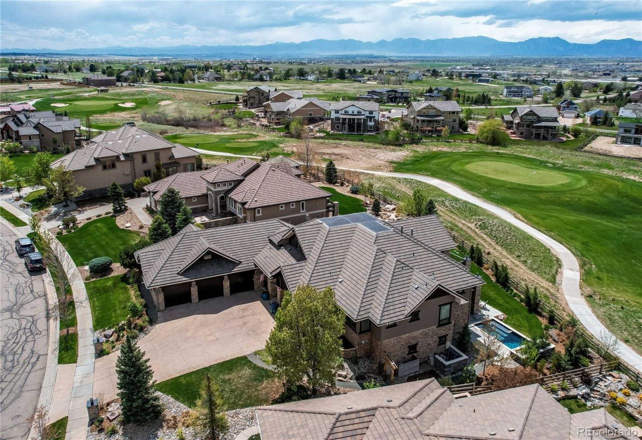 Set within the highly sought-after golf course community of Vista Ridge & Colorado National Golf Club, backing the fairway on hole #4, this exceptional custom ranch blends refined design with over 5,800 sqft of beautifully finished living space, complete with a walk-out basement. Designed for both comfort & unforgettable entertaining, the home offers a true chefs kitchen outfitted with premium Wolf, Bosch & Sub-Zero appliances, custom cabinetry, an oversized island & a generous walk-in pantry. The open-concept layout is highlighted by soaring 20+ foot ceilings, 8-foot doors, striking 12x48 porcelain tile flooring & elegant plantation shutters throughout. The main level features a luxurious primary retreat w/a private sitting area, fireplace & spa-inspired bath complete with a soaking tub, oversized multi-head shower & radiant heated floors. A richly appointed library w/built-in shelving & rolling ladder, along with a functional mudroom & laundry space, add both charm & convenience. The walk-out lower level is equally impressive, offering 3 additional bedrooms, a spacious second great room, & a dual level theater room w/high-end projection and surround sound. Entertain with ease at the full bar & dedicated wine room. Outdoor living is just as spectacular, with expansive covered upper & lower patios featuring built-in heaters and LED lighting, perfect for year-round enjoyment. The backyard is a private retreat with a tranquil water feature, raised garden beds, gas fire pit & a 10x18 heated pool with a secure rolling cover?all set against stunning Front Range & Longs Peak views. Car enthusiasts & hobbyists will appreciate the oversized 4-car garage (approx. 1,445 sq ft) with epoxy flooring, built-in cabinetry, extra depth & a lg finished storage space above. Residents enjoy access to top-tier neighborhood amenities including pools, clubhouse, dining, tennis & pickleball courts & a highly regarded elementary school? offering a lifestyle as elevated as the home itself.