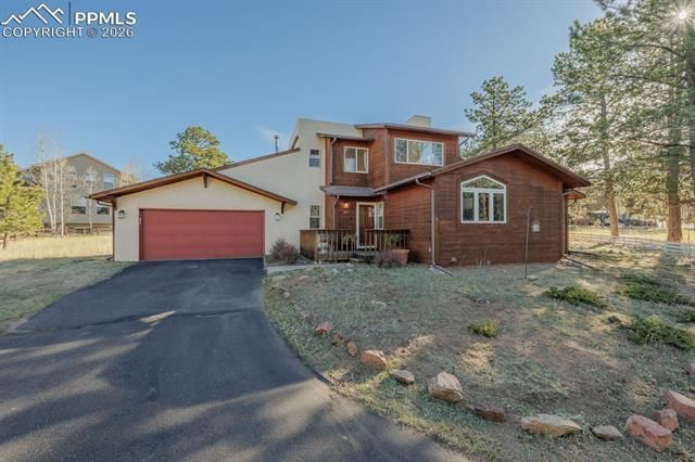 Charming mountain home in the highly desirable Crestwood Park neighborhood of Woodland Park. Tucked toward the back of a nearly half-acre lot, this property offers great privacy while still being close to it all. Located near schools, the neighborhood park, hiking and biking trails, the aquatic center, and just minutes to downtown—this is the perfect blend of quiet mountain living and convenience. Start your mornings on the patio taking in the sunrise over Pikes Peak, with frequent visits from local wildlife adding to the setting. The level, usable lot features natural landscaping, mature trees, and plenty of space to enjoy without high maintenance. Inside, natural light fills the home, highlighting the bright kitchen, dining room, and huge living room with vaulted ceilings and a cozy gas fireplace. The main level also includes two bedrooms and a full bathroom, along with new LVP wood flooring for a clean, updated feel. Upstairs is dedicated to the private primary suite, complete with large windows, built-in lighting, a walk-in closet, and an en-suite bath with double sinks and a walk-in shower. New carpet is scheduled for the upper level, giving the space a fresh, move-in-ready finish.