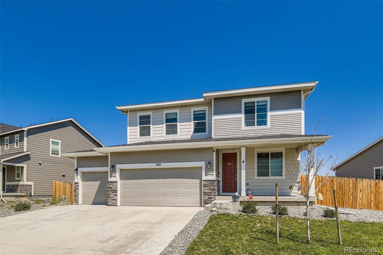 Welcome to 300 Wheatberry Drive, a stunning two-story home nestled in the desirable Brighton East Farms community. Built in 2021, this beautifully maintained residence offers the perfect blend of modern comfort, spacious design, and timeless curb appeal?all set on a generous 8,364 sq ft lot. Step inside to discover a bright and open layout that flows effortlessly from room to room. The main level features a welcoming family room, dining area, and a well-appointed kitchen that serves as the heart of the home?ideal for entertaining or quiet evenings in. A main floor formal living room/flex space with easy access to a half bath offers flexible living options, whether for an additional sitting room, music space or library. Upstairs, youll find the spacious primary suite complete with a private en-suite bath and ample walk-in closet space. Two additional bedrooms, 3/4 bathroom, private spacious loft and a convenient upstairs laundry room complete the second floor?providing both function and space for every lifestyle. Double sliding patio doors welcome you to the quaint backyard featuring an expansive patio and private covered veranda. This outdoor living space invites endless possibilities for year-round enjoyment, while the attached three-car garage offers plenty of room for vehicles, sporting gear and extra storage. Located just minutes from the community park, local schools, shopping, and easy access to I-76 & DIA, this home is perfectly positioned for both convenience and community. Whether youre looking to grow, settle in, or simplify, this home offers the space and setting to make your next chapter feel like home.