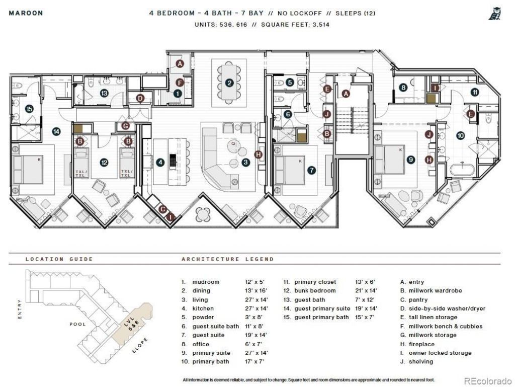 Welcome to Residence 536, a crown jewel of The Beckwiths premier slopeside collection. This to-be-built Maroon floor plan spans a grand 3,514 square feet, with four bedrooms, four and a half bathrooms, office, bunkroom, mudroom, and six balconies that deliver the most commanding ski area and mountain views in all of Crested Butte. This Residence is one of the most sought-after and private locations in the building, occupying its own wing. Inside, the open-concept kitchen, living, and dining space is framed by floor-to-ceiling windows that showcase 100% unobstructed views of the chairlifts, ski trail, Base Area, and the dramatic rise of the peak of Crested Butte Mountain and beyond. Step inside where custom touches bring Crested Buttes adventurous spirit indoors. The gourmet kitchen is a chefs dream with natural stone countertops, Thermador appliances, oversized pantry, and a generous island. Adjacent, a custom fireplace, dining room, and multiple balconies create a living space that is both expansive and intimate. The primary suite is its own private sanctuary with an extended balcony, millwork wardrobe, walk-in closet, and a spa-style en-suite bath featuring Kohler fixtures, a steam shower, and radiant finishes. Each of the three guest suites include dedicated baths and private balconies, while the bunkroom set up offers flexible sleeping space. Additional luxuries include a full laundry room with washer/dryer, mudroom with built-in cubbies, secure owners storage, custom millwork throughout, and dedicated office space. The Beckwith is the only ski-in, ski-out resort in the heart of Crested Buttes base area, with world-class amenities including a four-star, community-inspired hotel, seamless ski valet, luxurious spa, adventure concierge, and private mountain & social community, Club Beck. A multi-phased reimaging of Elevation Hotel & Spa will transform almost every space at the resort, with residences anticipated for completion in the Winter 26-27 ski season.