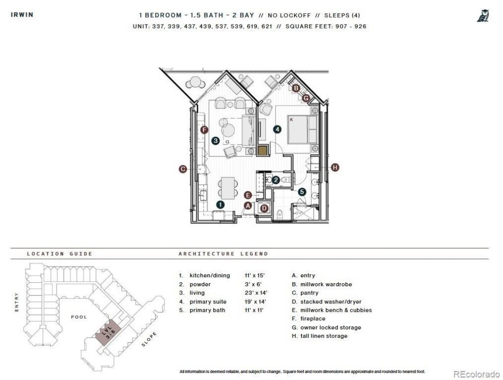 To-be-built Beckwith Residence 539 offers a rare blend of intimacy and grandeur within The Beckwiths exclusive ski-in, ski-out collection of 49 residences. This Irwin floor plan spans 926 square feet and features one bedroom, one bathroom, a powder room, and two private balconies that open to pool courtyard views. This residence is located just steps from the elevator for easy access. and features beautiful balconies overlooking the resorts hot tub and courtyard, with southwest-facing windows offering dynamic views of the surrounding mountain peaks, including Mt. Emmons and Red Lady Bowl. Inside, earthy neutrals, warm wood tones, and layered natural textures reflect the adventurous, creative soul of Crested Butte. A sleek electric fireplace anchors the living space, complemented by wide-plank wood flooring and expansive windows that fill the home with natural light. The gourmet kitchen features stone countertops, high-end appliances, a generous pantry, and a custom millwork entry bench with cubbies? blending beauty and functionality for everyday mountain life. The primary suite is a peaceful retreat with a private balcony, custom wardrobe, and a spa-inspired en-suite bath with Kohler fixtures and radiant finishes. A well-appointed powder room, in-unit laundry with stacked washer and dryer, and a secure owners storage locker add everyday ease and thoughtful detail. With its open-air balconies, inspired interiors, and ideal poolside location, the Irwin floor plan is your elevated home base in Crested Butte. The Beckwith is the only ski-in, ski-out resort in the heart of Crested Buttes base area, with world-class amenities including a four-star, community -inspired hotel, seamless ski valet, luxurious spa, adventure concierge, and private mountain & social community, Club Beck. A multi-phased reimaging of Elevation Hotel & Spa will transform almost every space at the resort, with residences anticipated for completion in the Winter 26-27 ski season.